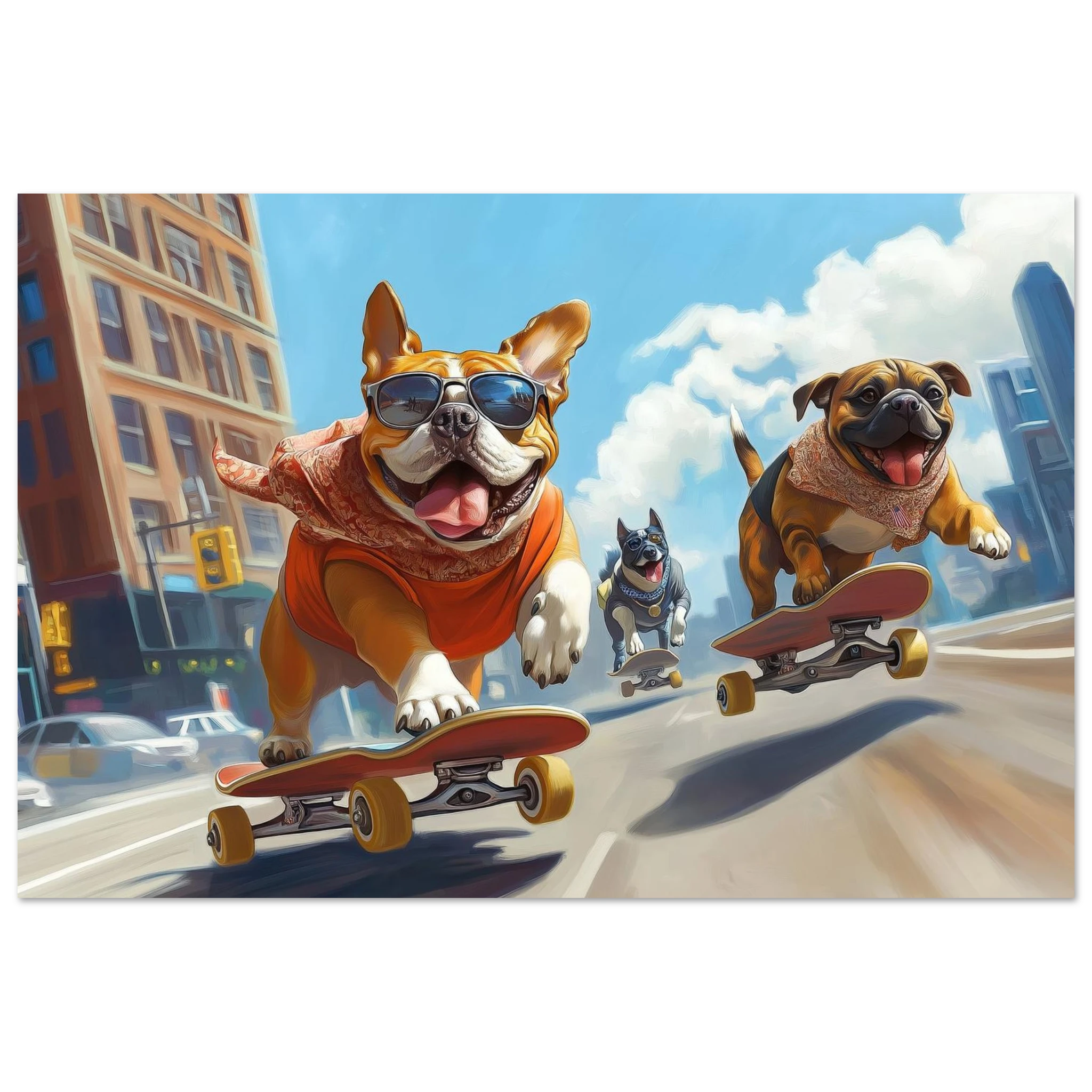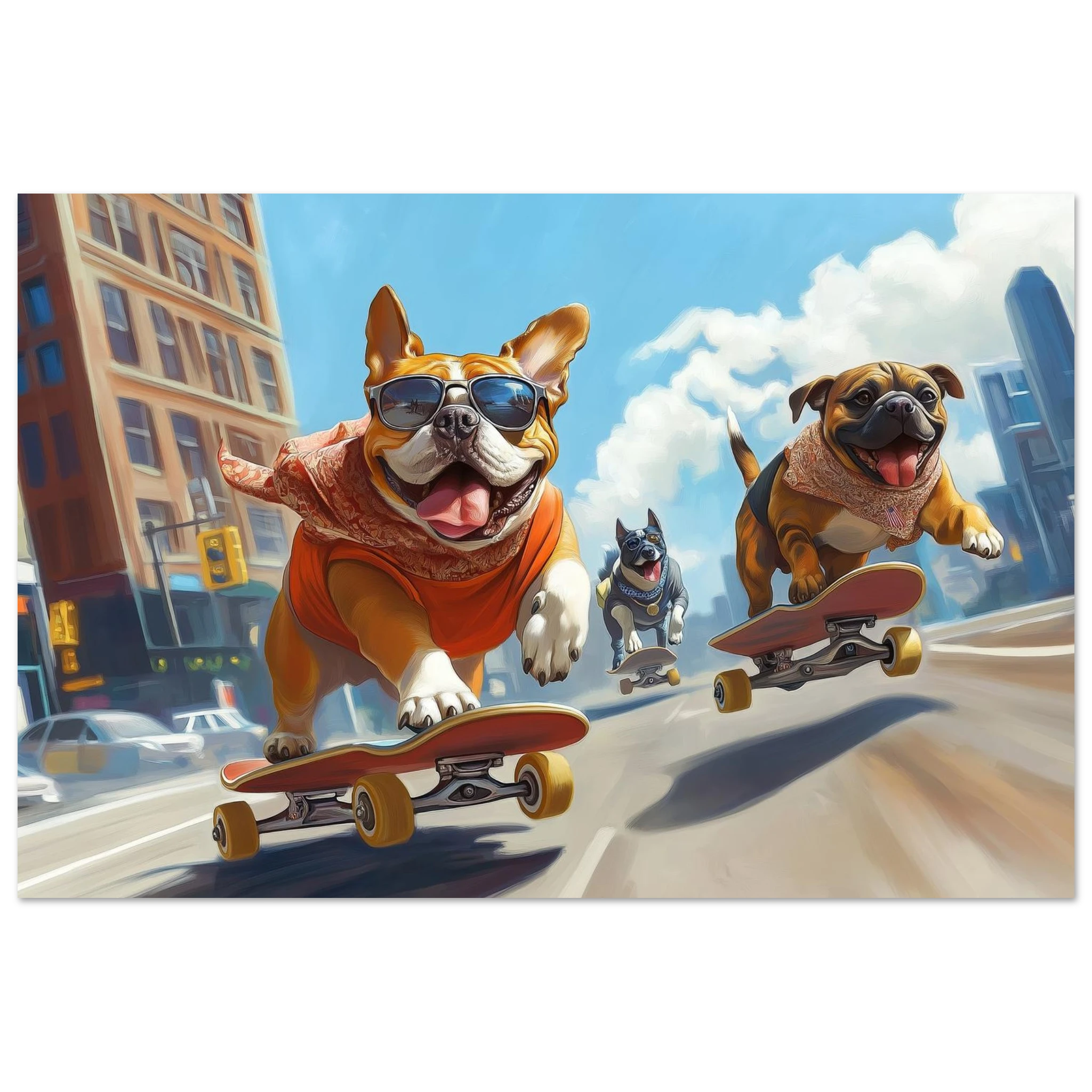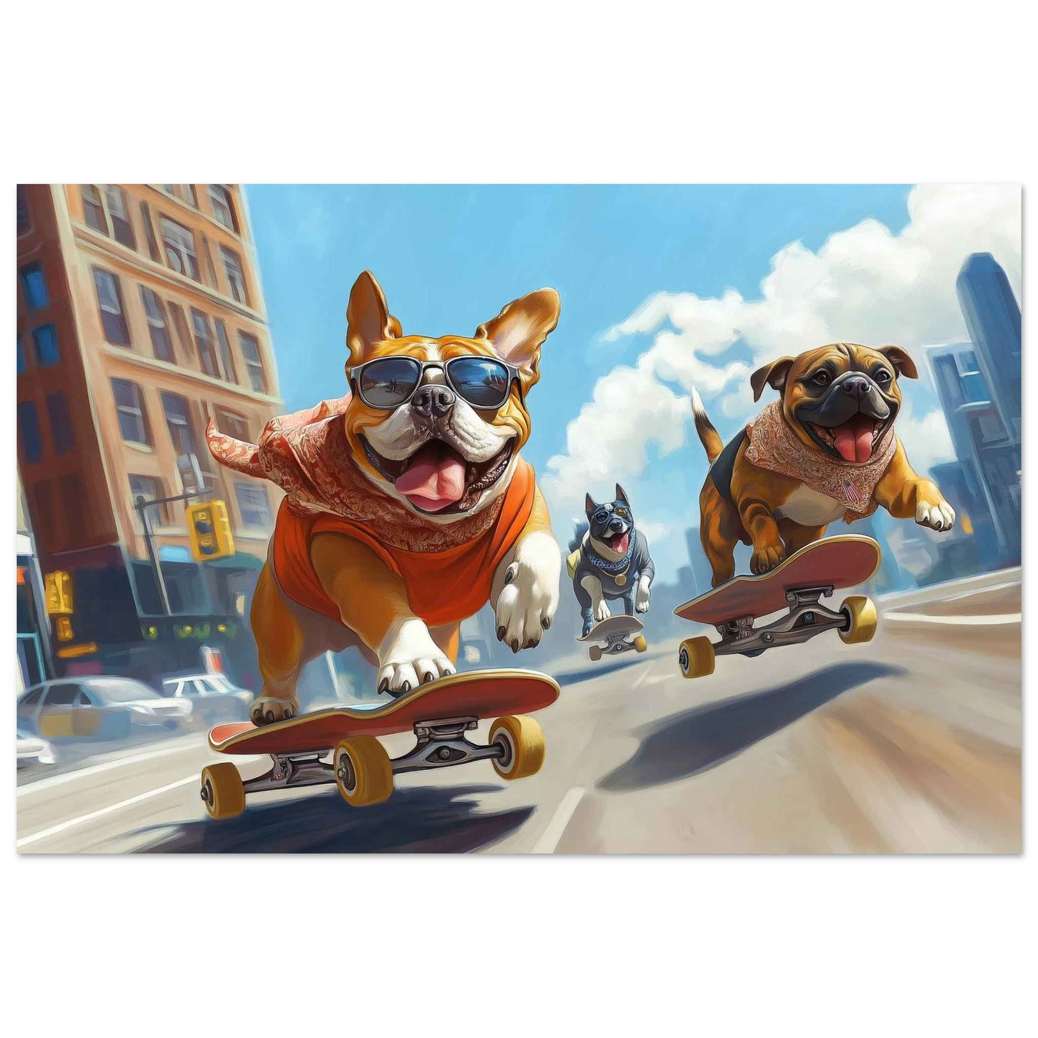 Imaginez trois chiens insouciants, skateboard en mains, filant avec agilité dans les rues d'une ville vibrante. Leurs pattes dansent sur le bitume, et leur énergie contagieuse réchauffe les cœurs. Ce visuel saisissant apporte une touche de fun et de joie à votre décor. Qui pourrait résister à cette bande de meilleurs amis sur roues ?