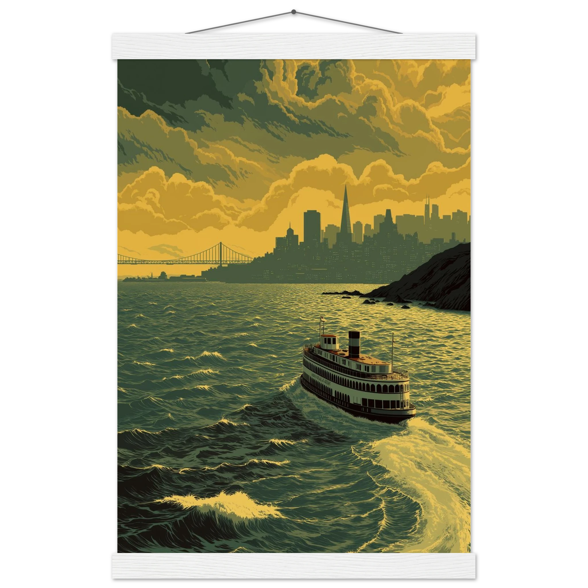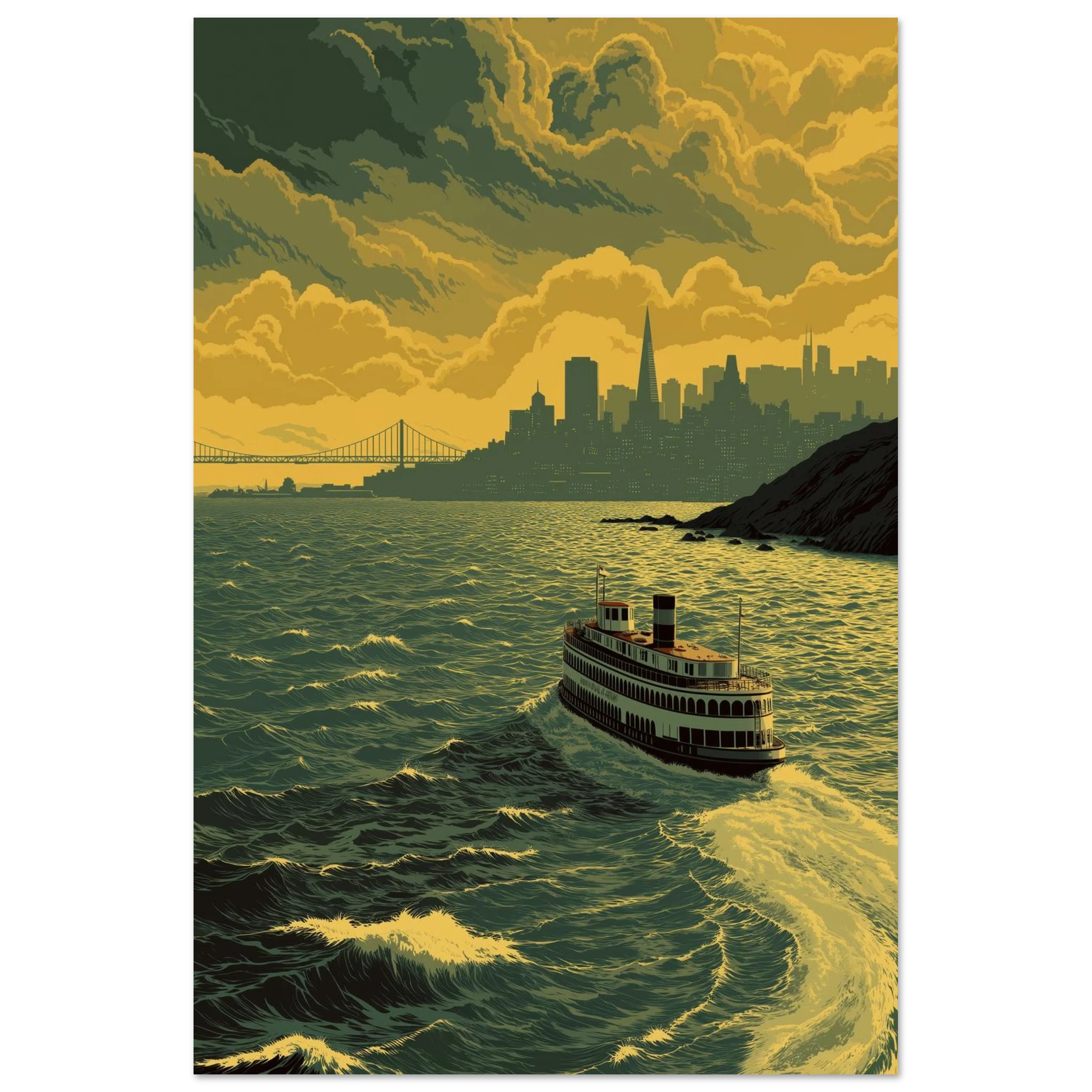 Laissez-vous envoûter par le spectacle du « Ferry au Crépuscule Doré ». Ce tableau évoque une ambiance mélancolique, où un ferry vintage navigue sur des eaux agitées, face à la silhouette emblématique de San Francisco. Les nuages massifs menacent le ciel doré-vert, créant une atmosphère dramatique et captivante. Quand avez-vous ressenti pour la dernière fois cette magie du crépuscule sur l’eau ?