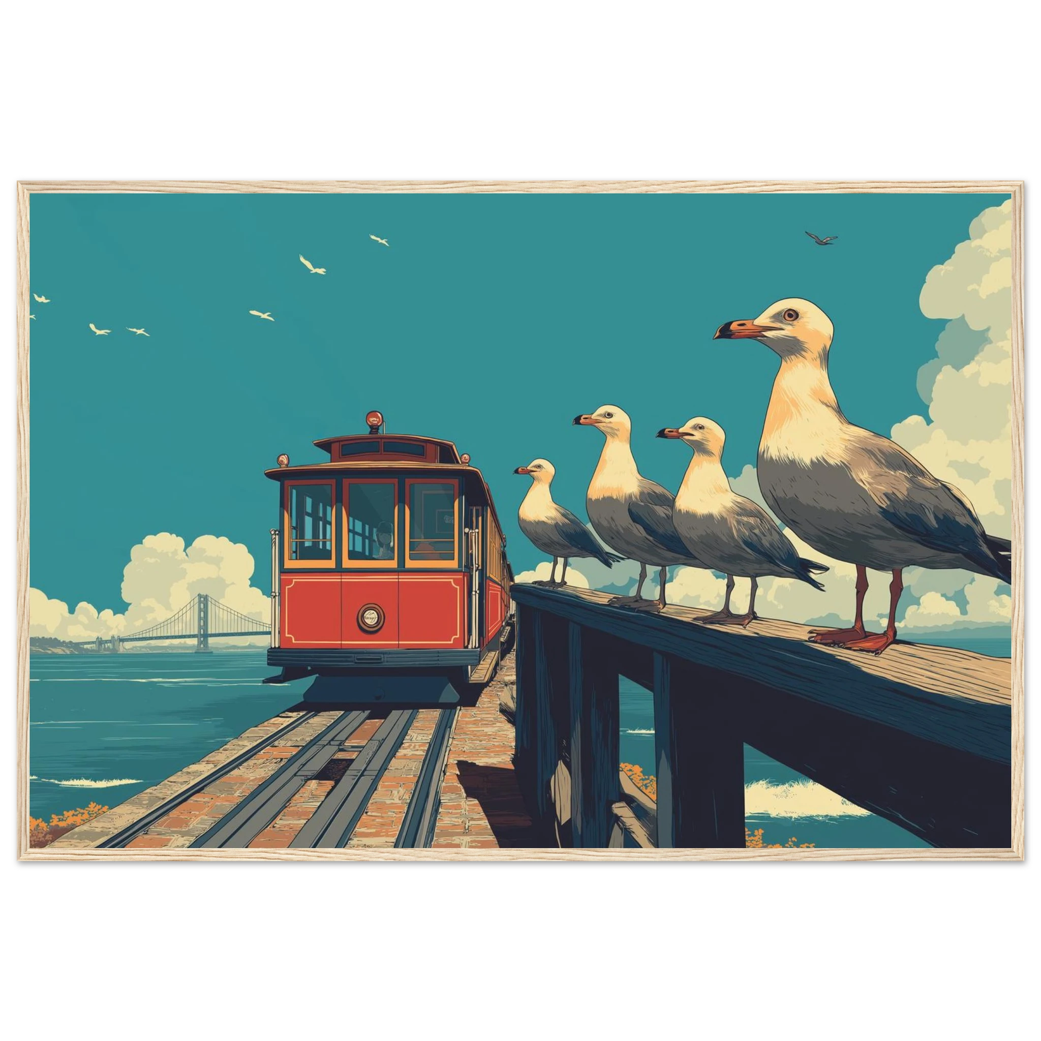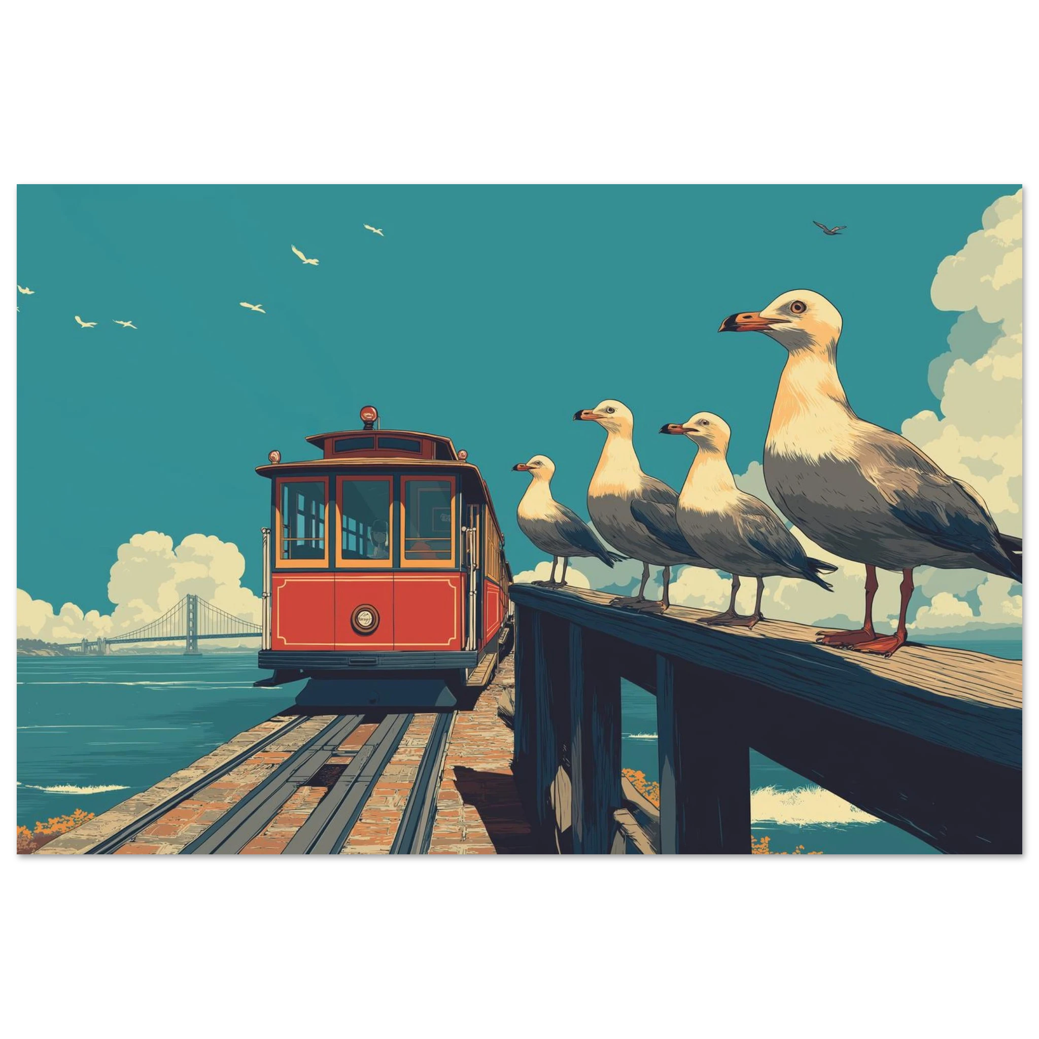 Laissez-vous transporter par l'image captivante de ce tramway rouge-orange sur le quai. Quatre mouettes dansent au premier plan, tandis que le Golden Gate Bridge se dresse majestueusement en arrière-plan. Cette illustration, inspirée du style anime de Studio Ghibli, vous plonge dans une atmosphère poétique et contemplative. N'est-ce pas un véritable tableau vivant prêt à embellir votre espace ?