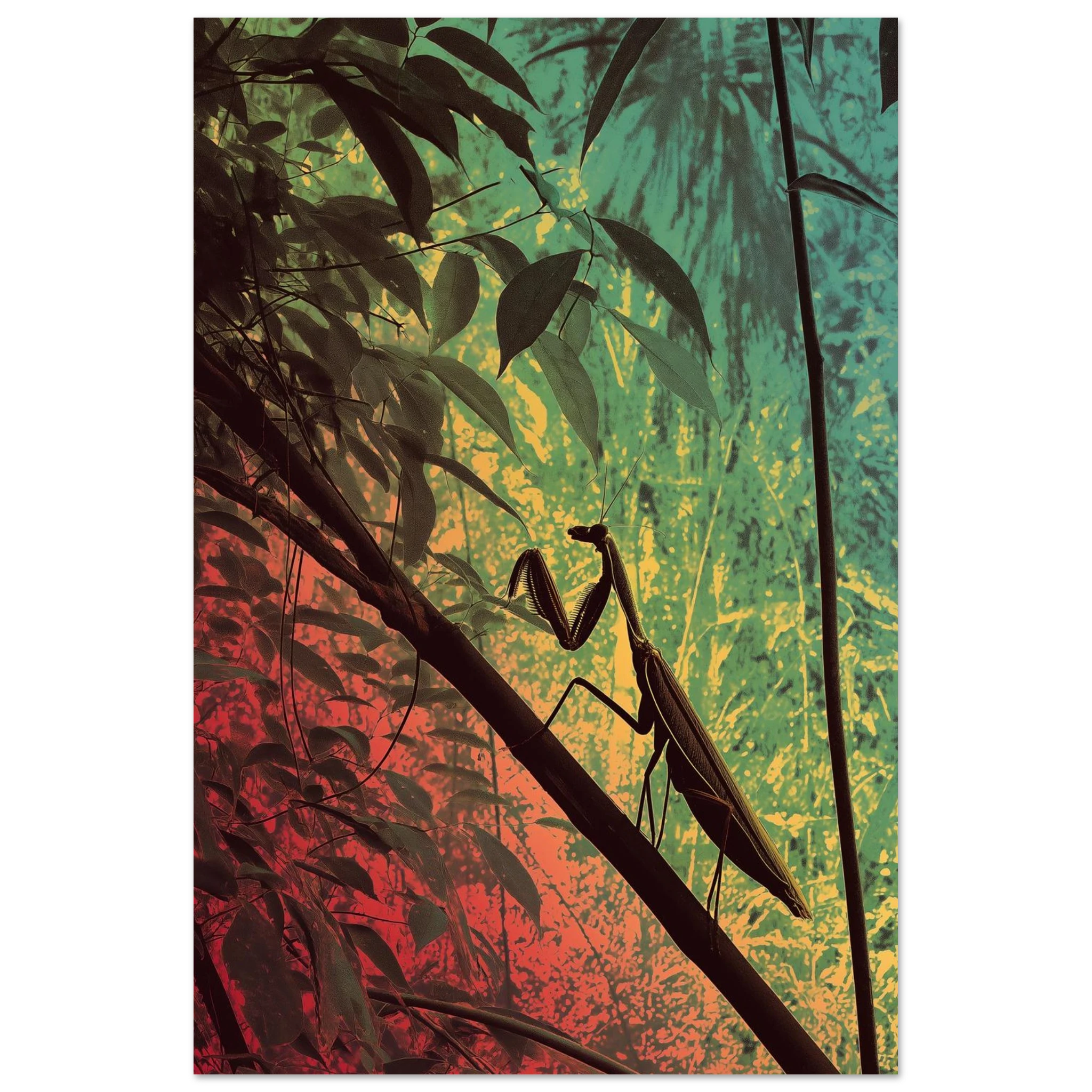Plongez dans un monde vibrant avec cette illustration de mante religieuse en silhouette. Dans une jungle luxuriante, les tons rose, vert, jaune et turquoise se mélangent délicieusement. Cet art psychédélique invite à l'évasion et à la rêverie. Imaginez-vous admirant cette œuvre éveillant vos sens et embellissant vos murs. Pourquoi ne pas donner une touche d’exotisme à votre intérieur ?