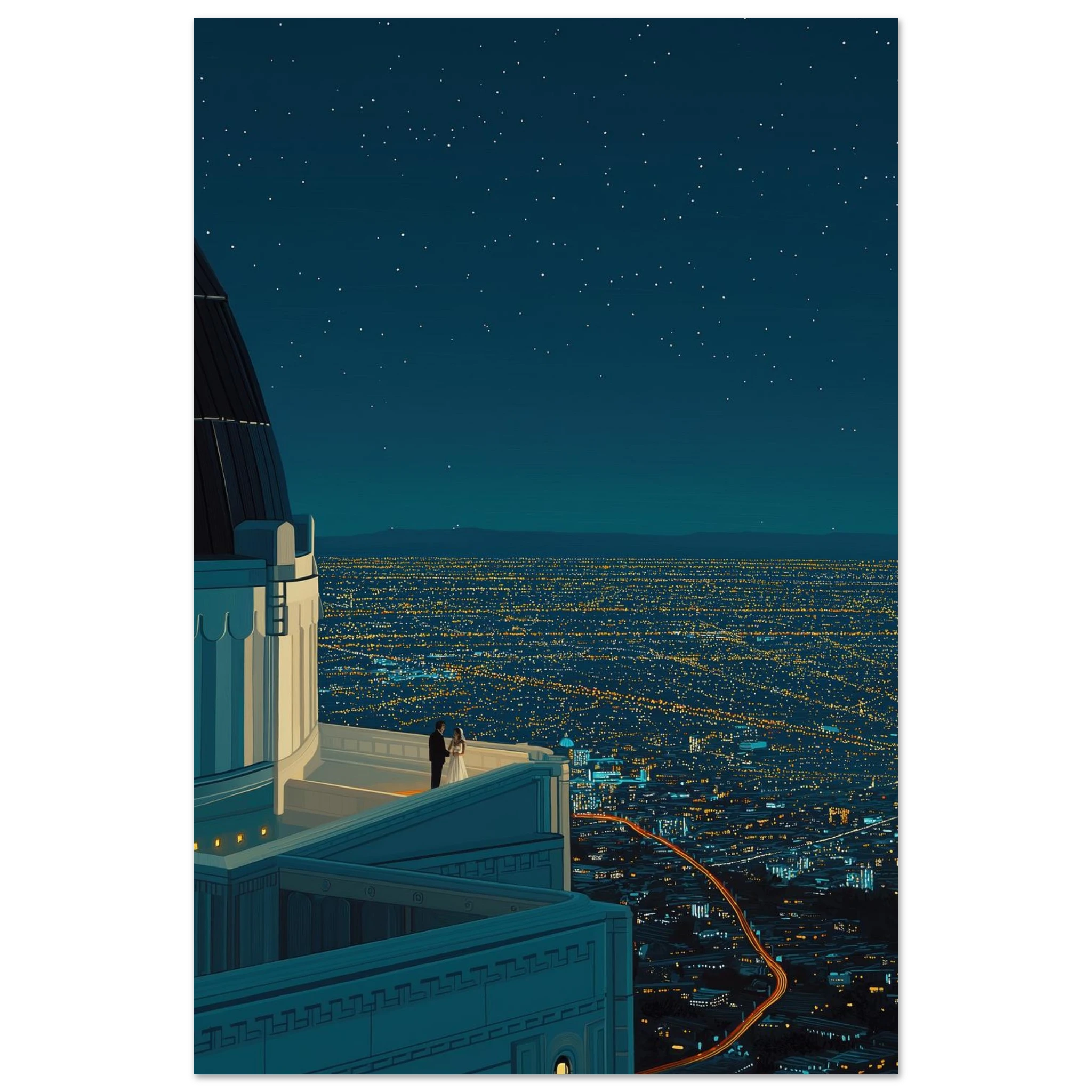 Imaginez-vous face à la splendeur de l'Observatoire Griffith, où la nuit californienne danse sous un ciel étoilé turquoise. Ce visuel saisissant de Los Angeles illuminée vous transporte au cœur de la magie urbaine. Chaque détail évoque une ambiance mystérieuse et romantique, faisant de cette œuvre un véritable voyage visuel. Prêt à laisser vos rêves s'envoler sous les étoiles ?
